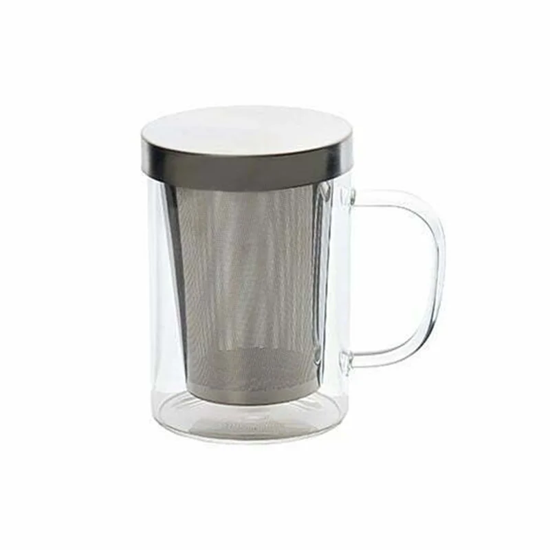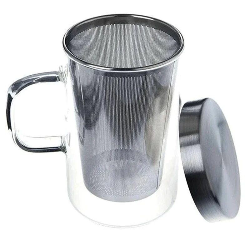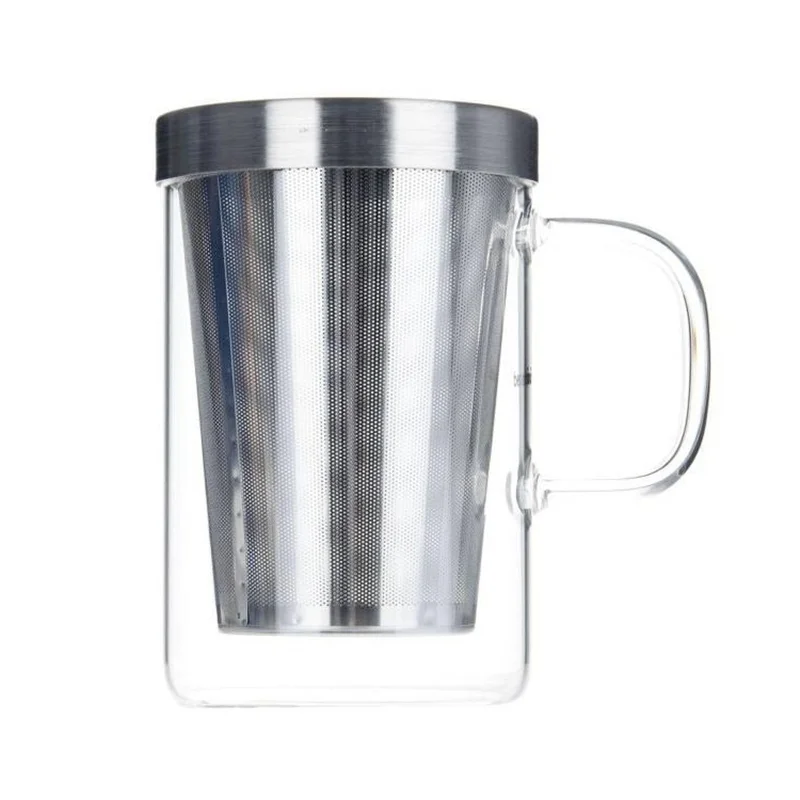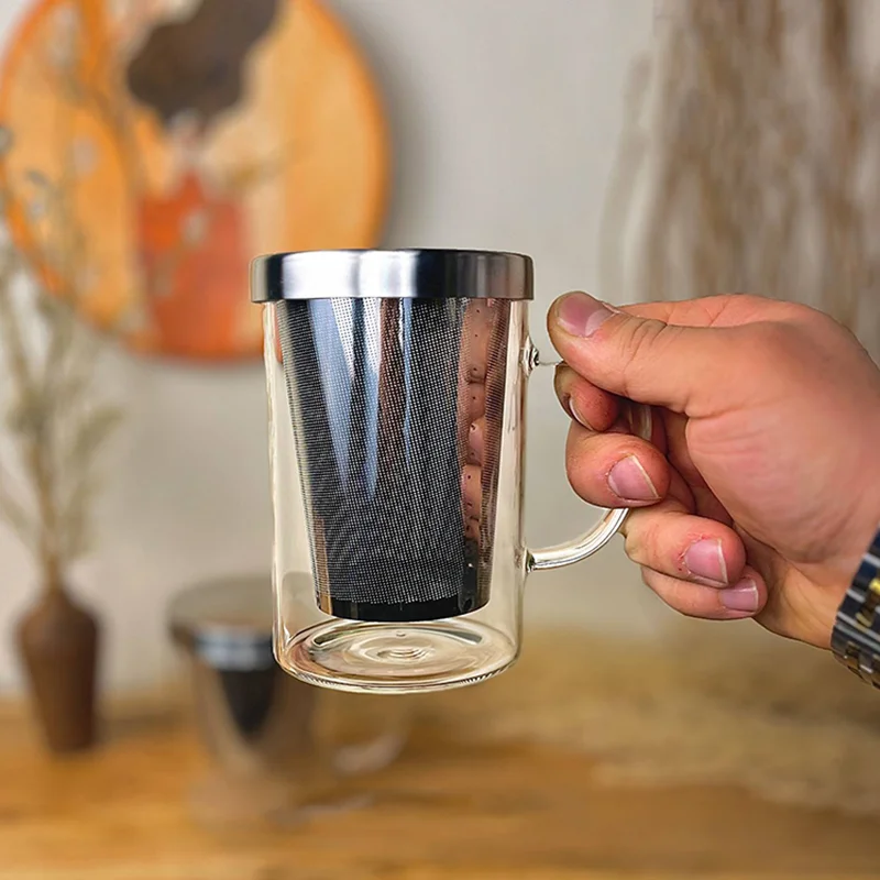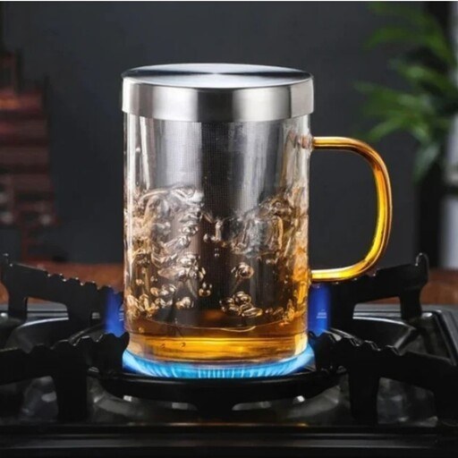 لیوان دمنوش پیرکس دسته دار با صافی و درب استیل ضد زنگ 304 و حجم 500 میلی لیتر محصولی شیک و با کیفیت است که برای تهیه و سرو چای و دمنوش های گرم طراحی شده است