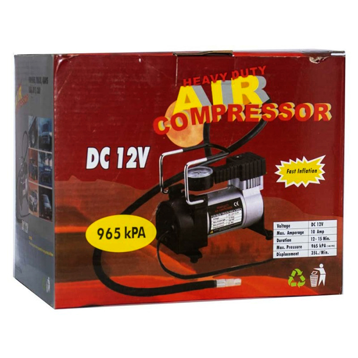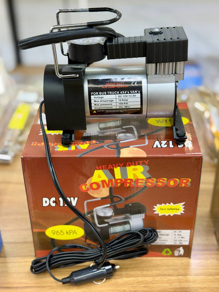 دستگاه پمپ باد کمپرسور برقی فندکی خودرو 965 KPA یکی از انواع کمپرسورهای کوچک و تک سیلندر ولی قوی و پر قدرت است که انرژی مورد نیاز خود را از باتری اتومبیل تامین میکند ؛ از این رو میتوانید بدون نگرانی از بابت نیاز به پریز برق شهری ، از این دستگاه در هر جایی استفاده کنید